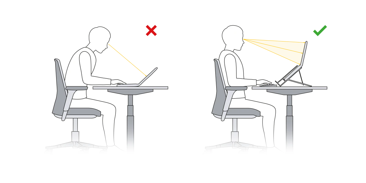 Deze laptop standaard is voorzien van zes verschillende hoogte-instellingen. Hiermee breng je je laptopscherm eenvoudig op ooghoogte. Zo voorkom je overbelasting van je nek en schouders en verbeter je je zithouding direct. Onderzoek laat zien dat een goede werkhoogte kan zorgen voor 32 procent minder nekbelasting en een toename in comfort van 21 procent. Ook werk je tot wel 17 procent productiever met een ergonomische standaard in combinatie met een extern toetsenbord en muis.