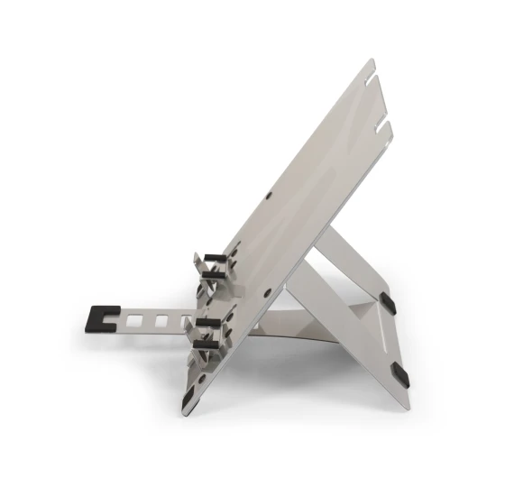 De FlexTop 270 is gemaakt van Hylite aluminium. Dit materiaal is krasbestendig, ultralicht en tegelijkertijd zeer stevig. De standaard weegt slechts 255 gram en is opgevouwen maar 4 millimeter dik. Daardoor past hij eenvoudig in je laptoptas of rugzak. Dankzij de schuimrubberen steunen en antislipvoetjes staat je laptop altijd stabiel, zelfs op een glad oppervlak.