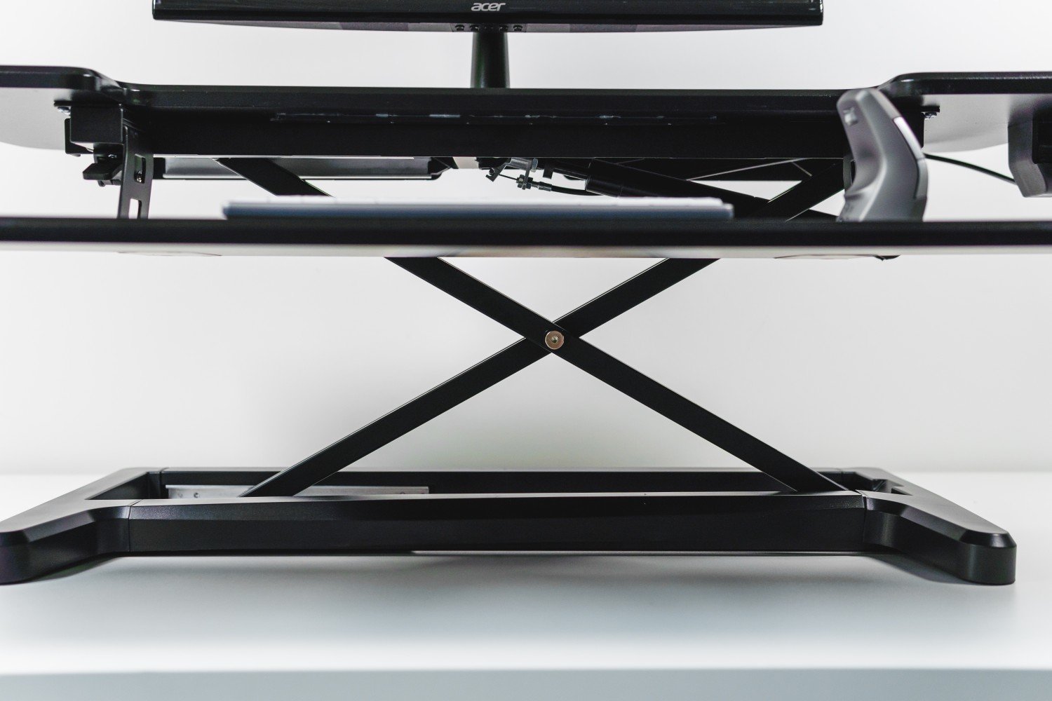 De Adjustable Sit-Stand Desk Riser 2 wordt volledig gemonteerd geleverd. Uitpakken, neerzetten en direct gebruiken. Geen schroeven, geen gereedschap, geen gedoe.