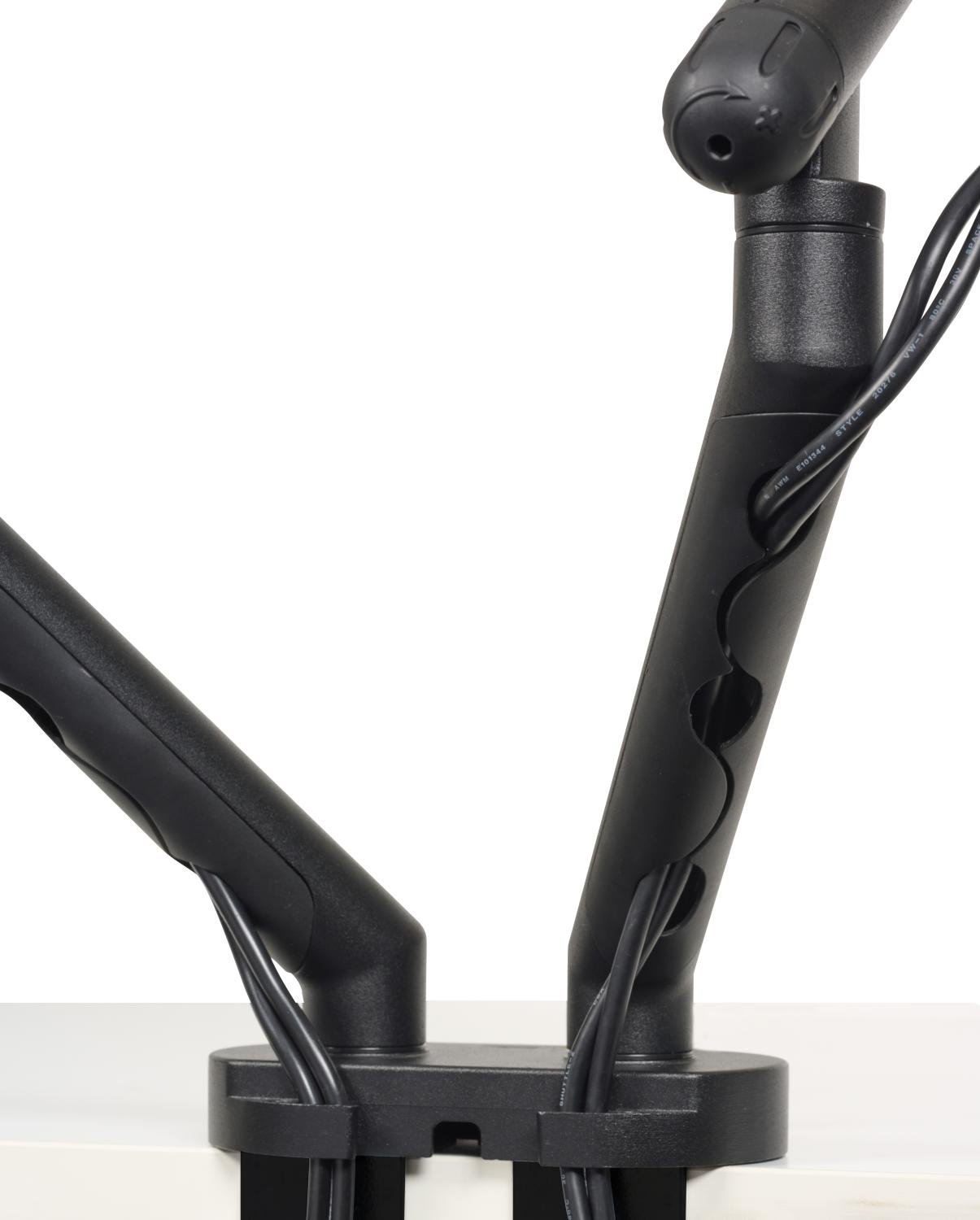 Met het geïntegreerde kabelmanagement houd je je werkplek strak en overzichtelijk. Kabels verdwijnen aan de onderzijde van de armen en worden aan de bovenzijde vastgehouden door een clip. Zo ziet je werkplek er altijd netjes en professioneel uit.