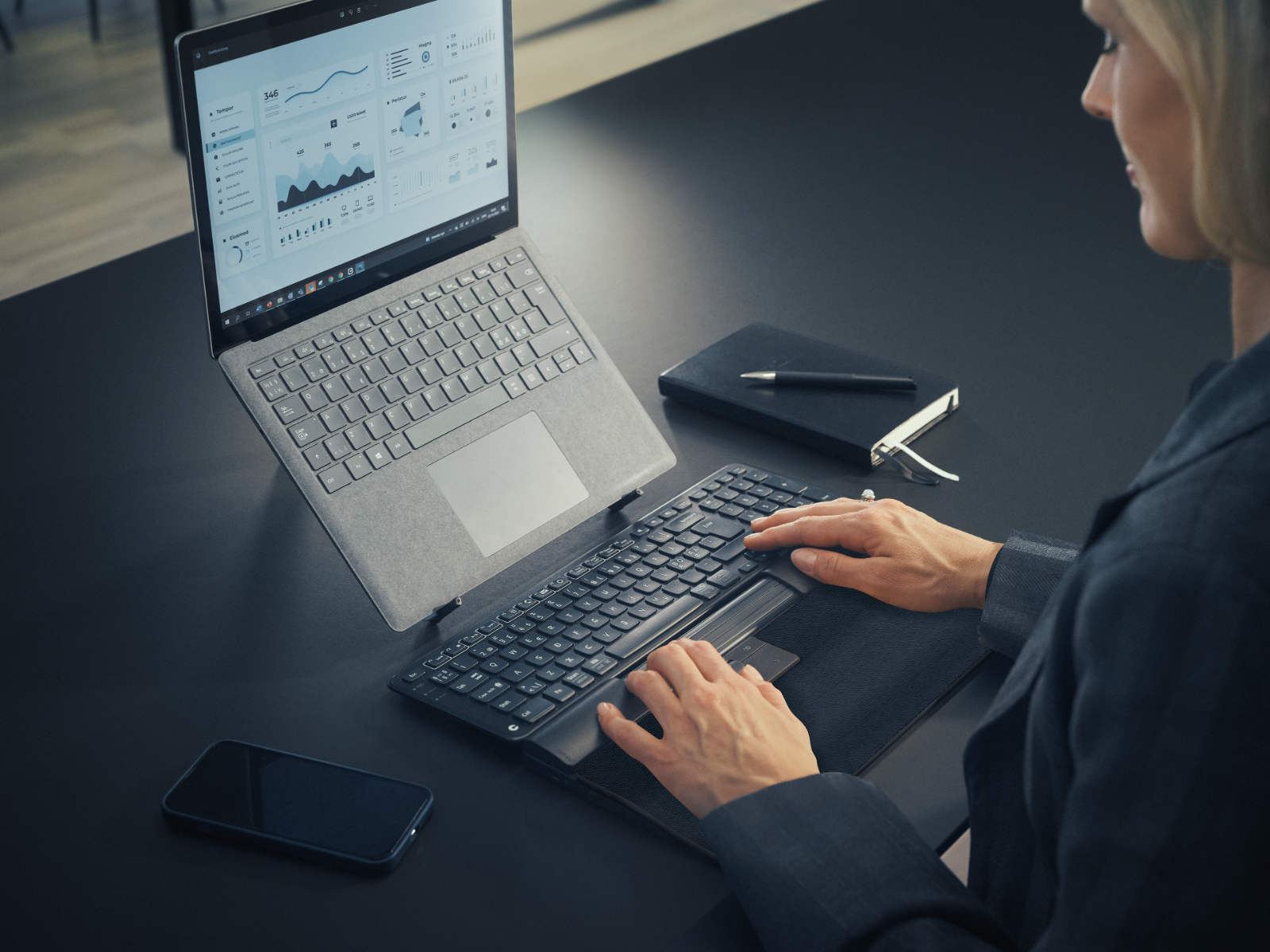 Sluit de SliderMouse Pro aan op je pc of Mac via Bluetooth, de USB-ontvanger of een kabel, afhankelijk van de SliderMouse Pro waar je voor kiest. De SliderMouse Pro is geschikt voor elk formaat toetsenbord. Bedien meerdere schermen tegelijk en stel uw favoriete snelfuncties in middels de programmeerbare knoppen.
