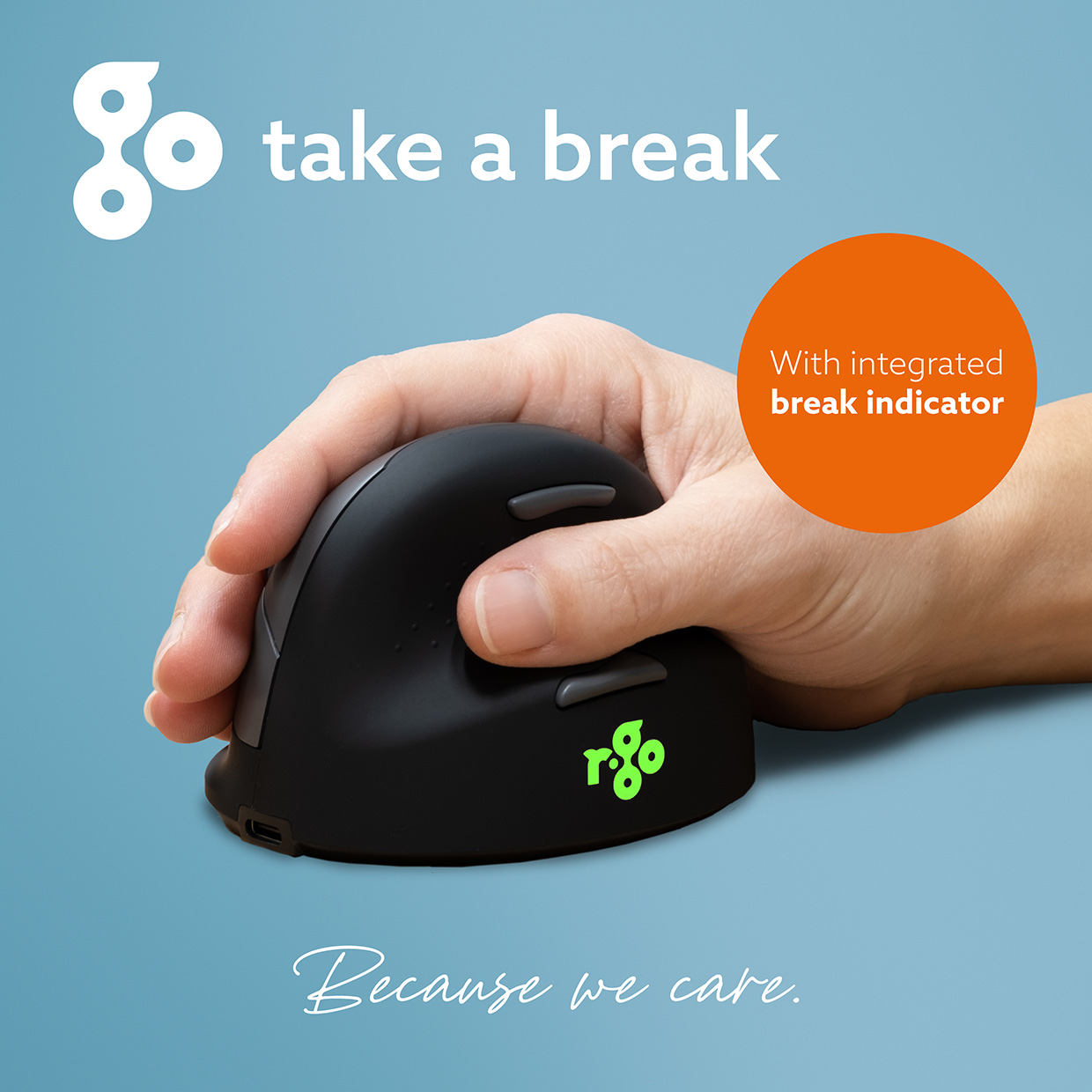 Werk je lang achter elkaar? De optionele R-Go Break pauzesoftware herinnert je aan gezonde werkpauzes. De muis geeft met een subtiel oplichtend logo aan wanneer het tijd is voor een onderbreking. Groen is goed, oranje betekent dat je even moet pauzeren, en rood dat je te lang hebt doorgewerkt. Zo voorkom je overbelasting zonder dat je er zelf aan hoeft te denken. Let wel: deze software werkt alleen op Windows.
